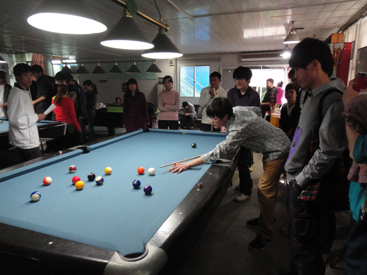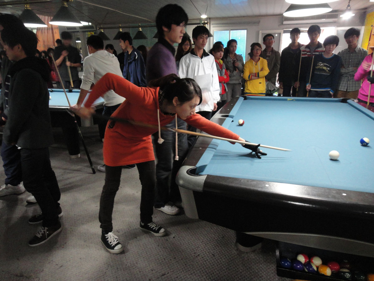 19日率先进行的小组赛,由09级刘佳乐、李宜琨、王少璇、刘玉婷、聂子晔和10级刘洋组成的台球队代表我院出赛。每场比赛分为男双、女双、混双三局。比赛过程中,我院队员凭借精湛的技艺,先后以2:1,3:0和3:0的成绩战胜了艺术学院、海洋与环境学院和人文学院,毫无悬念的进入了五强争夺赛。