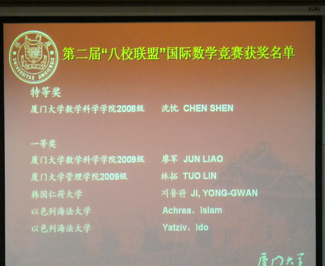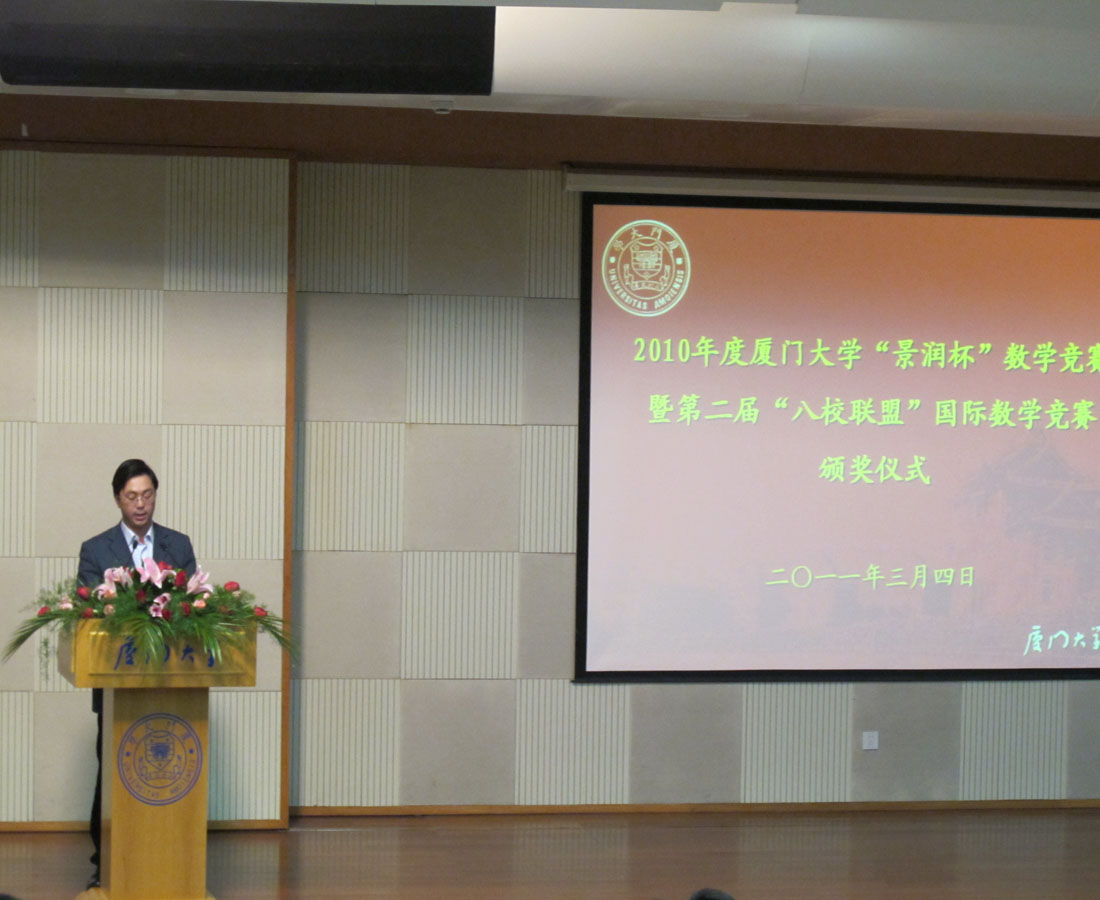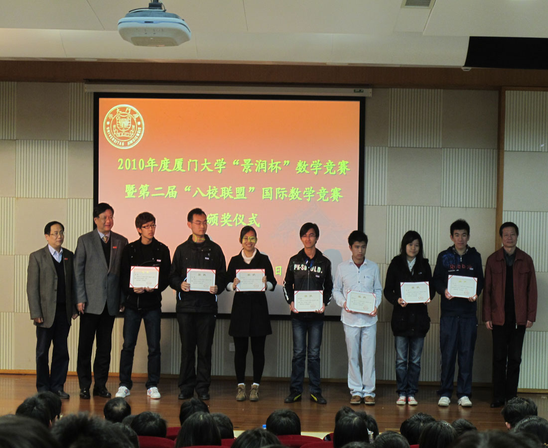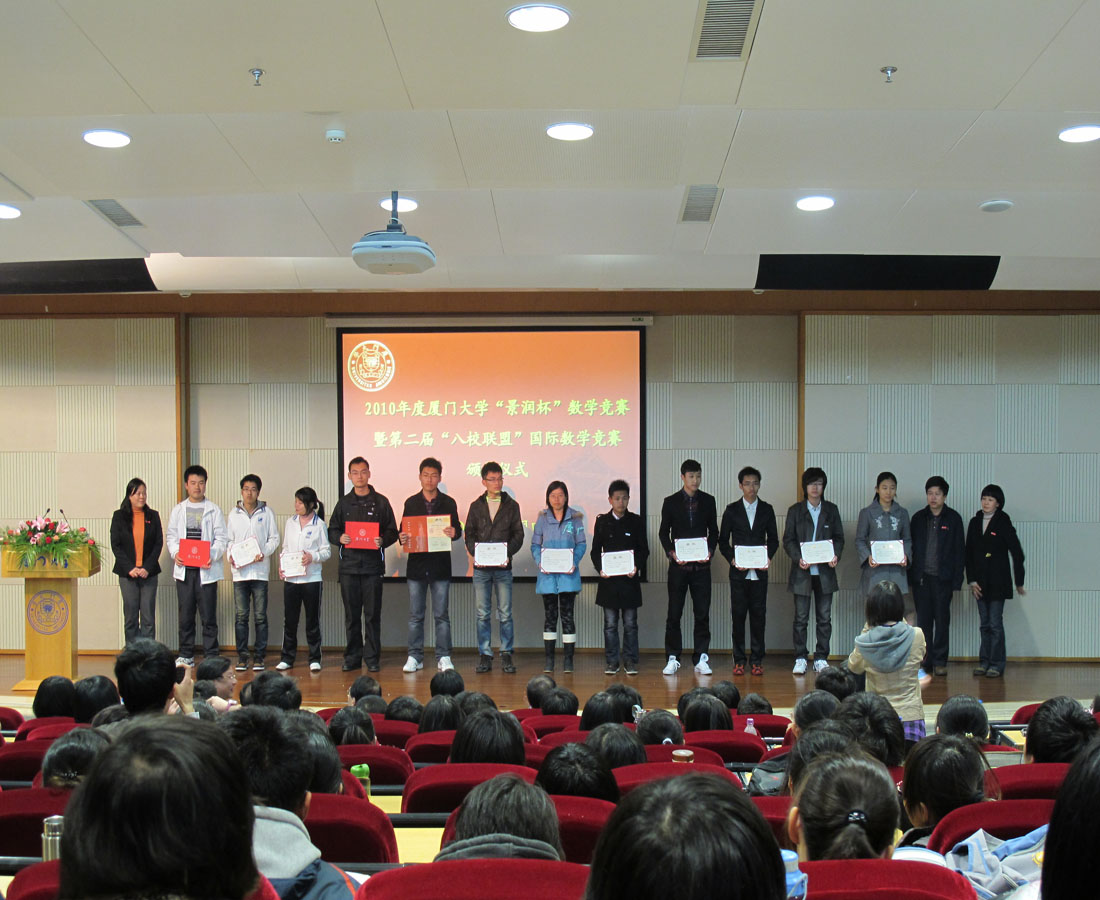 2011年3月4日晚上7点,2010年度厦门大学“景润杯”数学竞赛暨第二届“八校联盟”国际数学竞赛颁奖仪式在厦门大学漳州校区小报告厅举行。到场的领导有厦门大学副校长邬大光、厦门大学校长助理王巧萍、国际处处长毛通文、漳州校区管委会副主任黄田、经济学院党委副书记王艺宏、信息科学与技术学院党委副书记李芬芬、我院院长林亚南、副院长邱春晖、公共数学教学部主任林建华等。107名获奖学生及09、10级学生代表参加了此次颁奖典礼。