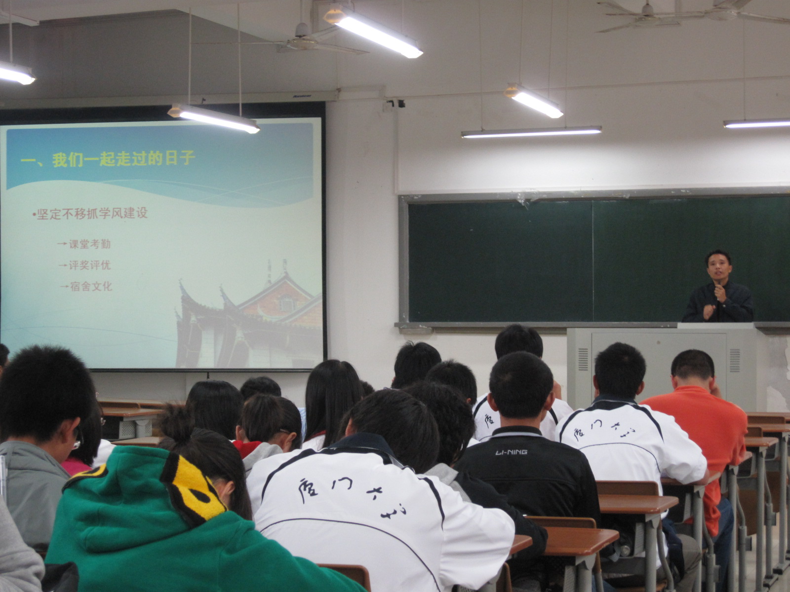 首先,杨老师就开学两个月以来我们开展的活动进行了总结:我们在广播操比赛中取得了历年来最好的成绩,获得了12名的好成绩;迎新晚会上同学们出色的演出赢得了在场老师和领导的一致好评;3+2篮球赛中,同学们都走出宿舍,积极地参与其中;秋季田径运动会上,我们的总成绩比去年足足进步了六名;游泳运动会上,漳州校区也取得了团体第7名的好成绩。杨老师说,取得的这些丰硕的成果与同学们的努力是密切相关的,希望同学们在今后的各项活动,继续发扬努力拼搏的精神。