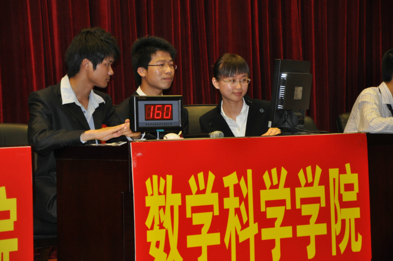 由09级姜冲,张树成和08级张晨薇组成的数学科学学院代表队在与海洋与环境学院,管理学院,国际关系学院,新闻传播学院等五个学院的同场竞技中,最终以出色的表现夺得了决赛二等奖的优异成绩。