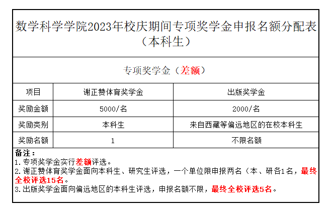 2023年校庆期间将评选颁发校级奖学金,提前发布专项奖学金(差额)评选,评奖工作有关事项通知如下: