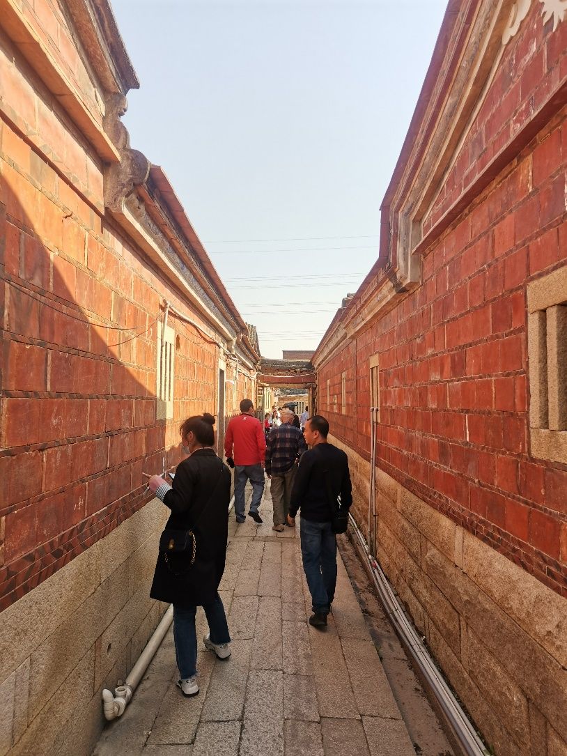 走下九日山,前往官桥,参观当地的蔡氏古民居,房屋结构均采用穿斗式木构架,硬山屋顶。大家听着导游的讲解,欣赏着闽南古建筑的屋脊高翘,雕梁画栋。漫步在花岗石的路面,穿过狭长的石埕大道,午后的阳光下,高墙的影子画着美丽的流线,仿佛时光不曾走过。